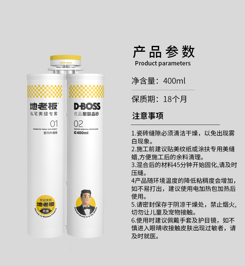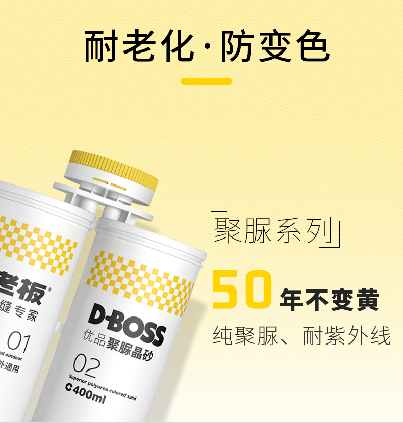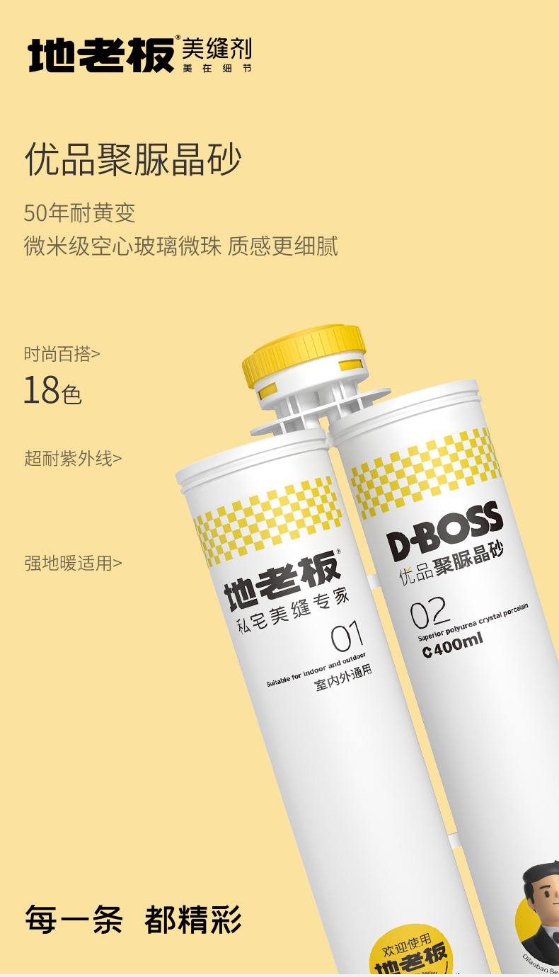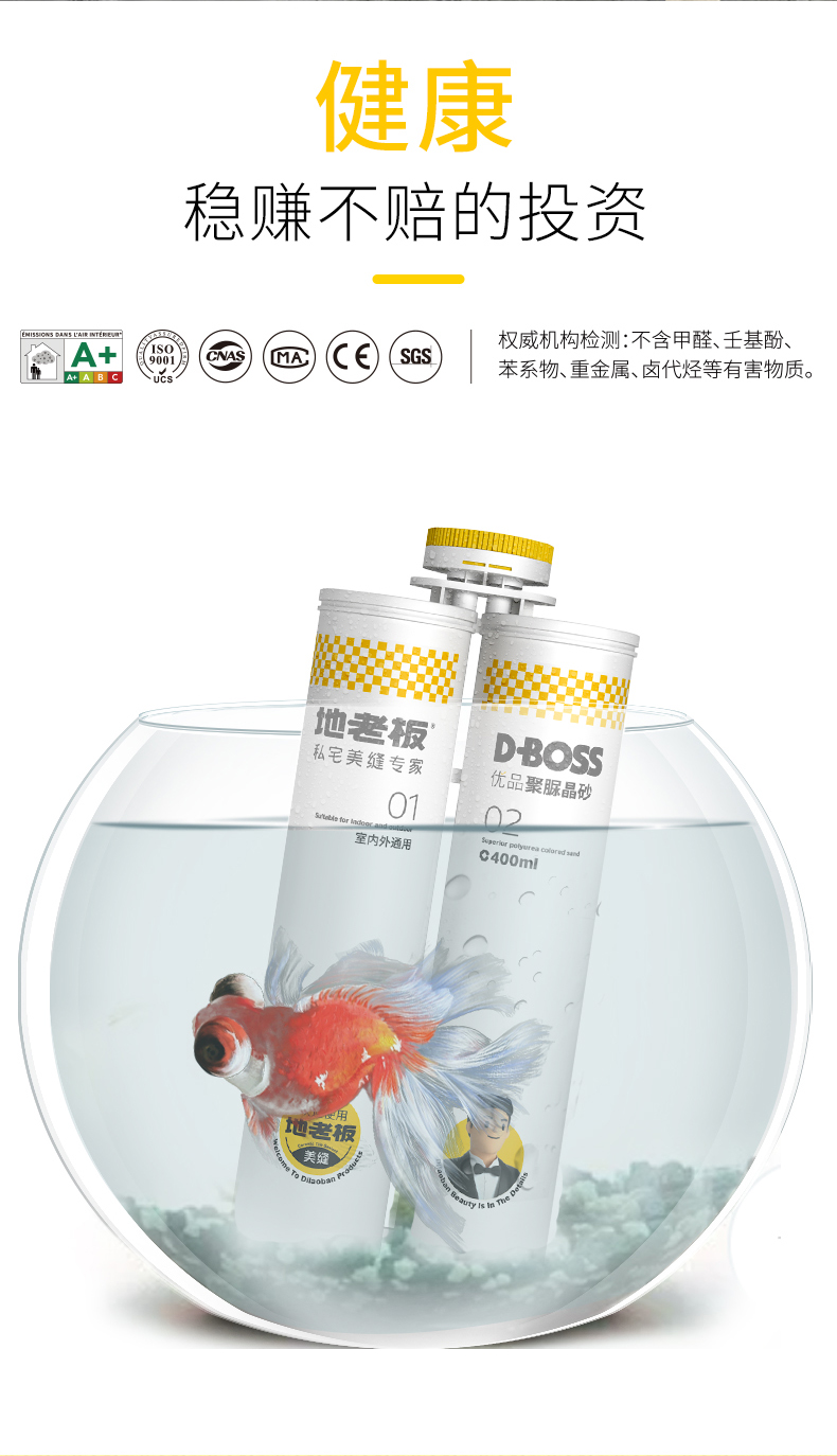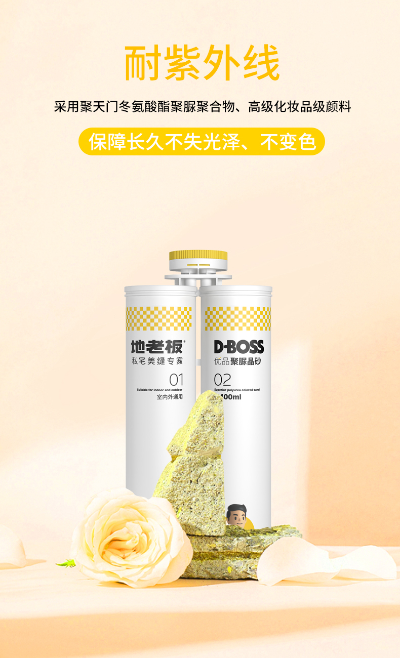 地老板?優品聚脲晶砂美縫劑由聚天門冬氨酸酯聚脲聚合物、高級化妝品級顏料及空心玻璃微珠精制而成的美縫產品。其具有更好的耐紫外線能力,保障長久不失光澤、不變色。玻璃微珠成分使磨砂質感更細膩。 本產品通過ISO9001:2015質量管理體系認證,嚴格按照T/CECS 10158-2021及GB 18583-2008標準執行,通過歐盟SGS產品質量檢測、CE安全產品認證及法國室內環境檢測A+認證,綠色環保。