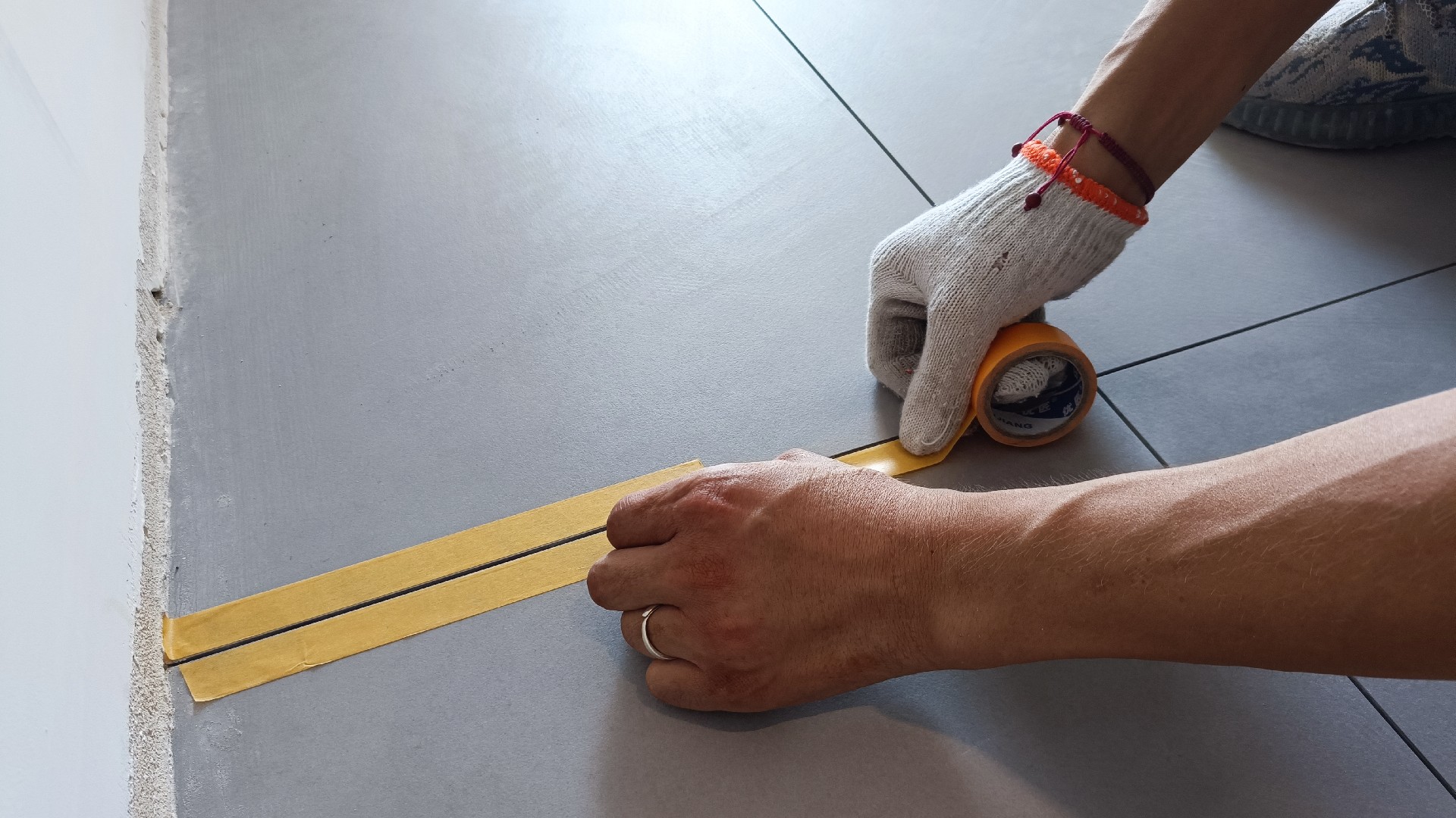 很多人在進行美縫施工時,經常在清理縫隙后就直接進行打膠處理了,這是萬萬不可以的,因為美縫劑打膠后要進行壓縫處理,縫隙旁的瓷磚上必定會有大量的美縫劑,固化后再進行清理,因為膠與瓷磚已經粘連,需要一點一點的鏟,太費時間還容易清理不干凈,瓷磚也特別容易出現損壞,所以為了保護瓷磚和美縫固化后好清理,美縫師們都會對縫邊進行保護處理。