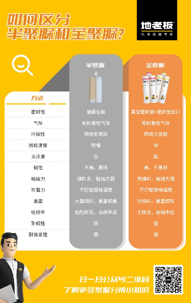 其中短時間內肉眼可見的區別: 密封性:半聚脲是普通包裝,全聚脲是真空密封袋+密封出膠口 即全聚脲擰開瓶蓋后,還需要使用美工刀劃開出膠口。而半聚脲沒有基礎的密封,擰開瓶蓋就能擠出材料,因為純聚脲遇空氣很快會固化,所以必須要密封。 氣味:半聚脲有刺激性氣味,全聚脲無刺激性氣味 環保性:半聚脲美縫劑材料不純粹,環保性較差,所以半聚脲燃燒時會有黑煙產生,而全聚脲美縫劑材料內部不添加含有機化合物的催化劑,所以全聚脲燃燒時沒有黑煙 重量:半聚脲大量填料,重量較重,全聚脲無填料,重量輕 光澤度:半聚脲打出來的膠體光澤度低,全聚脲打出來的膠體光澤度很高 附著力:半聚脲因為添加一些材料,粘結力不強,所以即使美縫前不打蠟,也是容易清理的,但全聚脲的粘結力很強,不打蠟是很難清理的 粘結力不強意味著美縫劑后期會很容易脫落 韌性:半聚脲韌性差,鏟除余料的時候,容易碎,但全聚脲韌性很高,不會輕易被折斷 全聚脲美縫產品優勢眾多,從根本上上解決了傳統美縫劑不能解決的痛點,全聚脲美縫劑的耐磨性、韌性、耐黃變都很強,使用壽命是可以長達50年左右的。 不是所有廠家生產的聚脲美縫都是全聚脲,但地老板的聚脲美縫保證是真正的全聚脲。而且地老板采用進口原料、純聚脲配方,嚴格執行國家標準,地老板聚脲美縫實力表現也經受住了嚴苛的市場檢驗,在全國大多數城市,都是可以看到地老板的聚脲美縫劑的身影的。